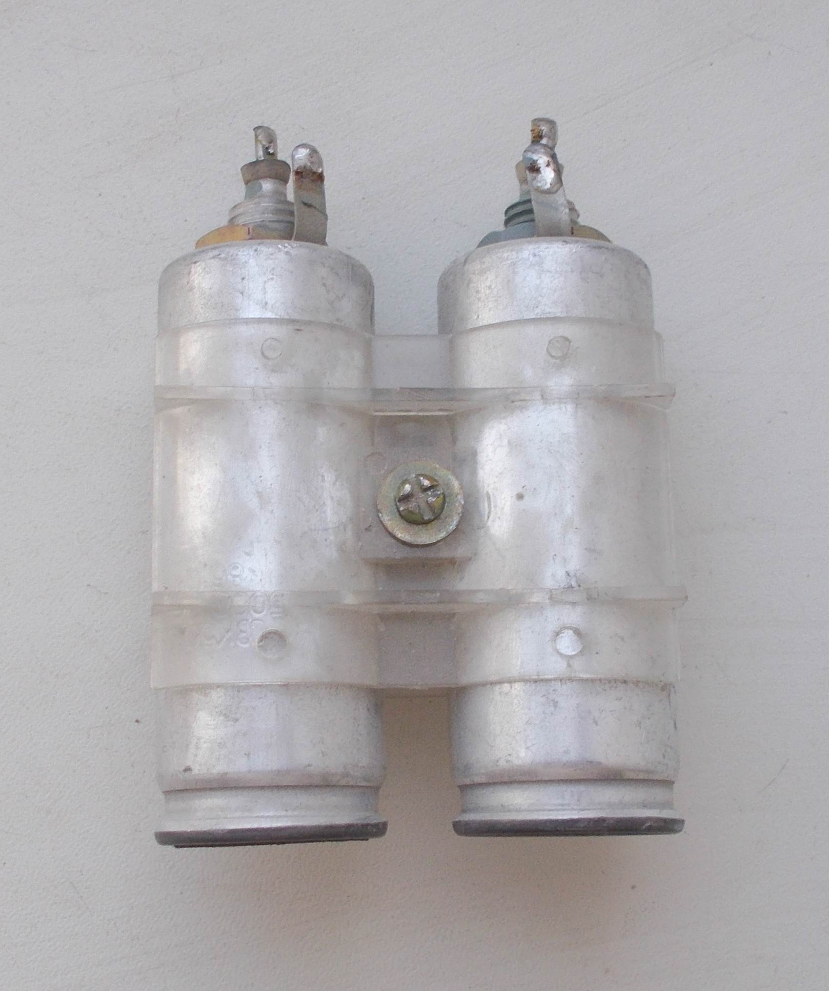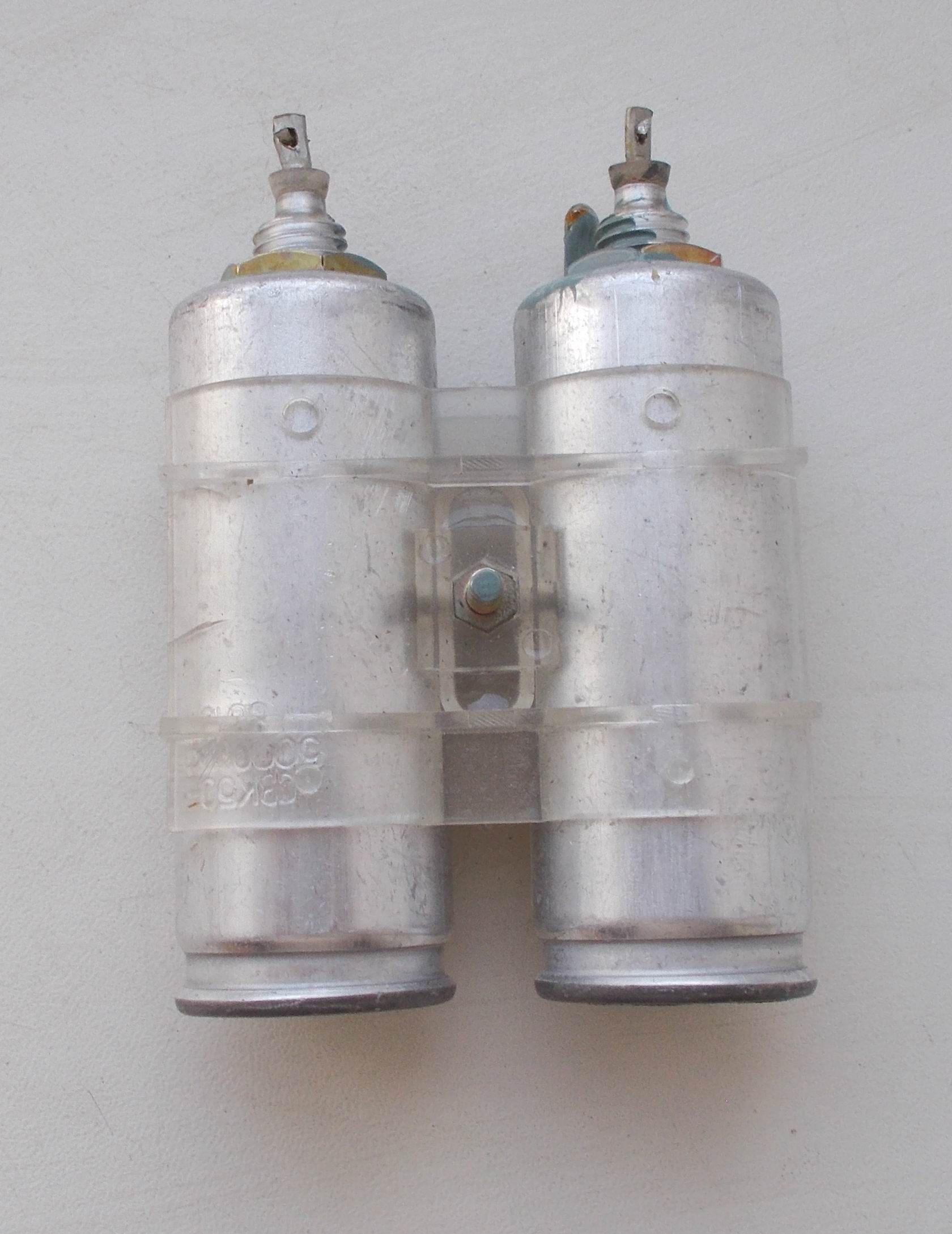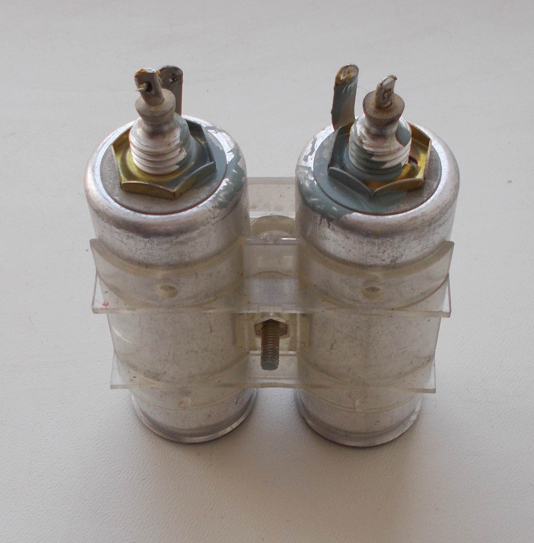 Два конденсатора 2000мкФх50В с креплением Два конденсатора 2000мкФх50В с креплением к корпусу. Конденсаторы зажимаются двумя половинками и стягиваются винтом. Потом этим же винтом крепится к корпусу. + один конденсатор К50-6 2000мкФ х 50В Цена 30 грн
