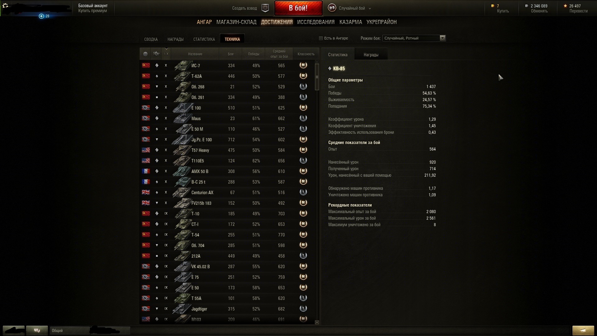 Исследовано, но не куплено: ИС4, Об 268, ФВ 215 183 калибра(бабаха), Франзуцкая пт АМХ Ас мле 48, Type 61, O-ni Waffenträger auf Pz. IV, Т34-2, M46 Patton, Churchil 7, CrusaderSP
