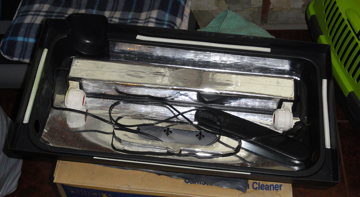 2. Крышка природа, обклеена пленкой изнутри, просверлены 2 дырки по бокам, приспосаблиал лампу на 18 ватт + к имеющейся на 15, балласт на 15вт, балласт на 18вт, все разобрано