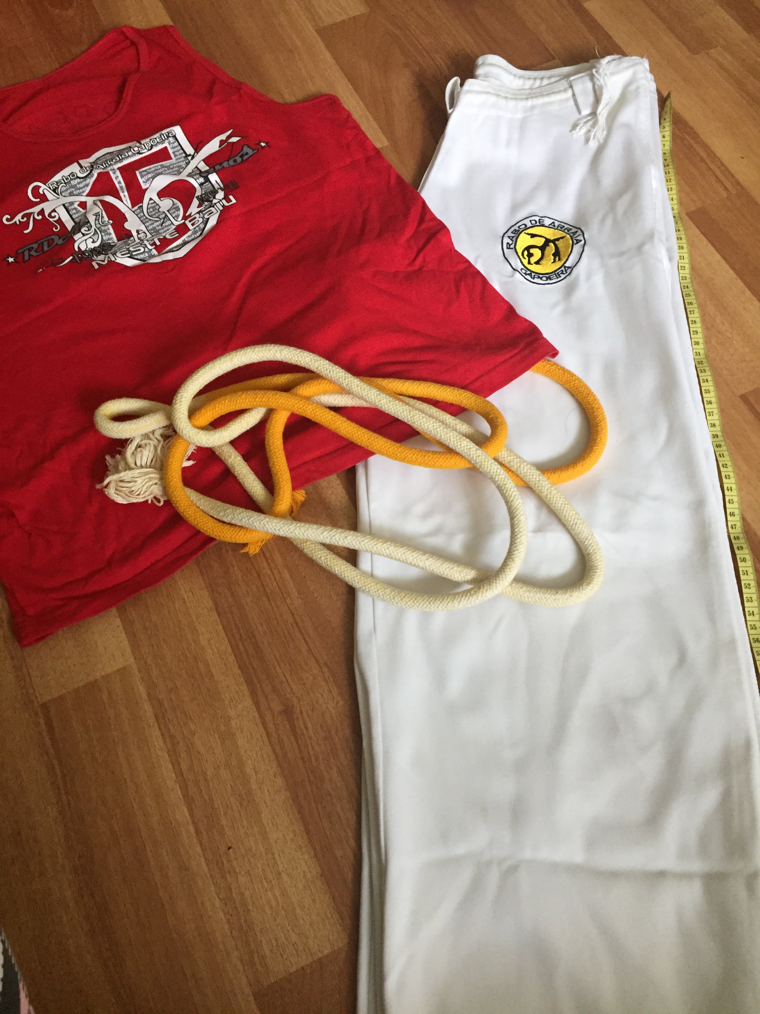 Штаны в хорошем состоянии - не порваны и нету зашитого. Они носились на тренировки, а потом просто лежали в шкафу. Из-за этого они уже не белоснежнобелые. Размер - м (мидиум - средний). Длинна штанины - 95 см. полуобхат бедер - 44 см.