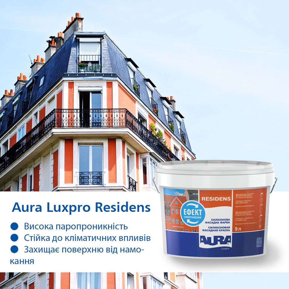 Силіконова фасадна фарба «Aura Luxpro Residens» призначена для утворення на мінеральних фасадах паропроникного, стійкого до атмосферних та механічних впливів, стійкого до УФ випромінювання покриття. Рекомендується для використання в умовах промислового та морського середовища.