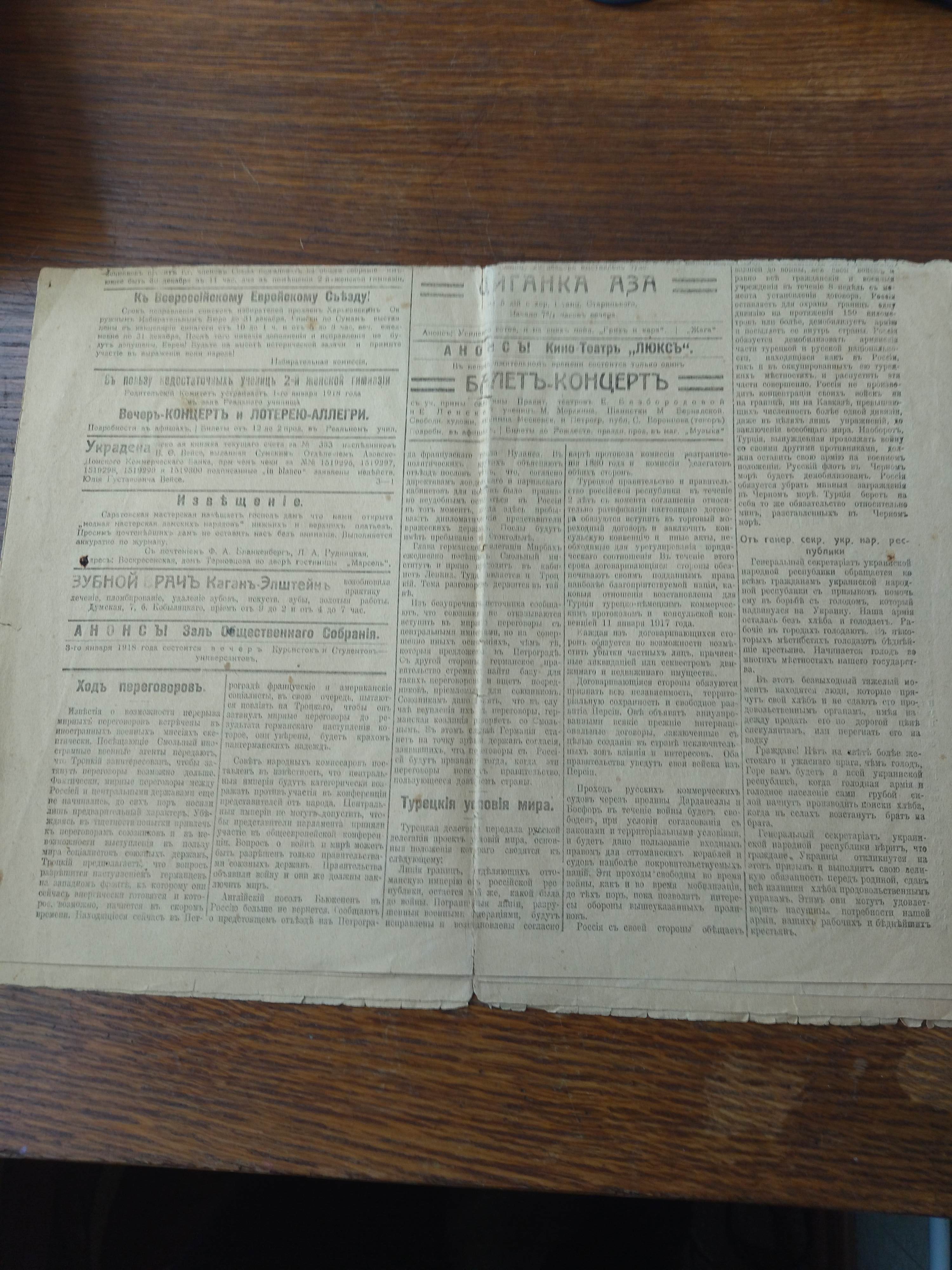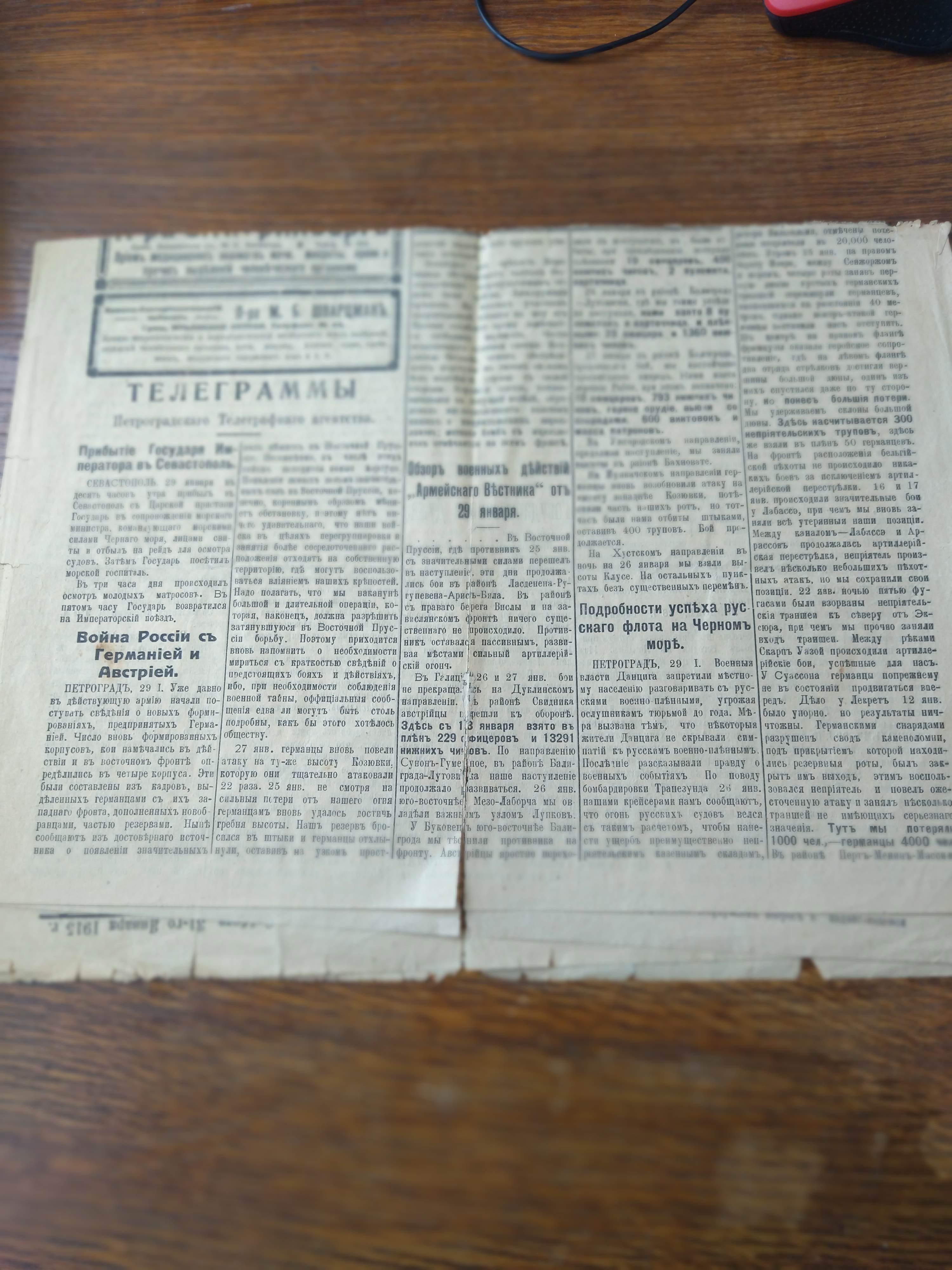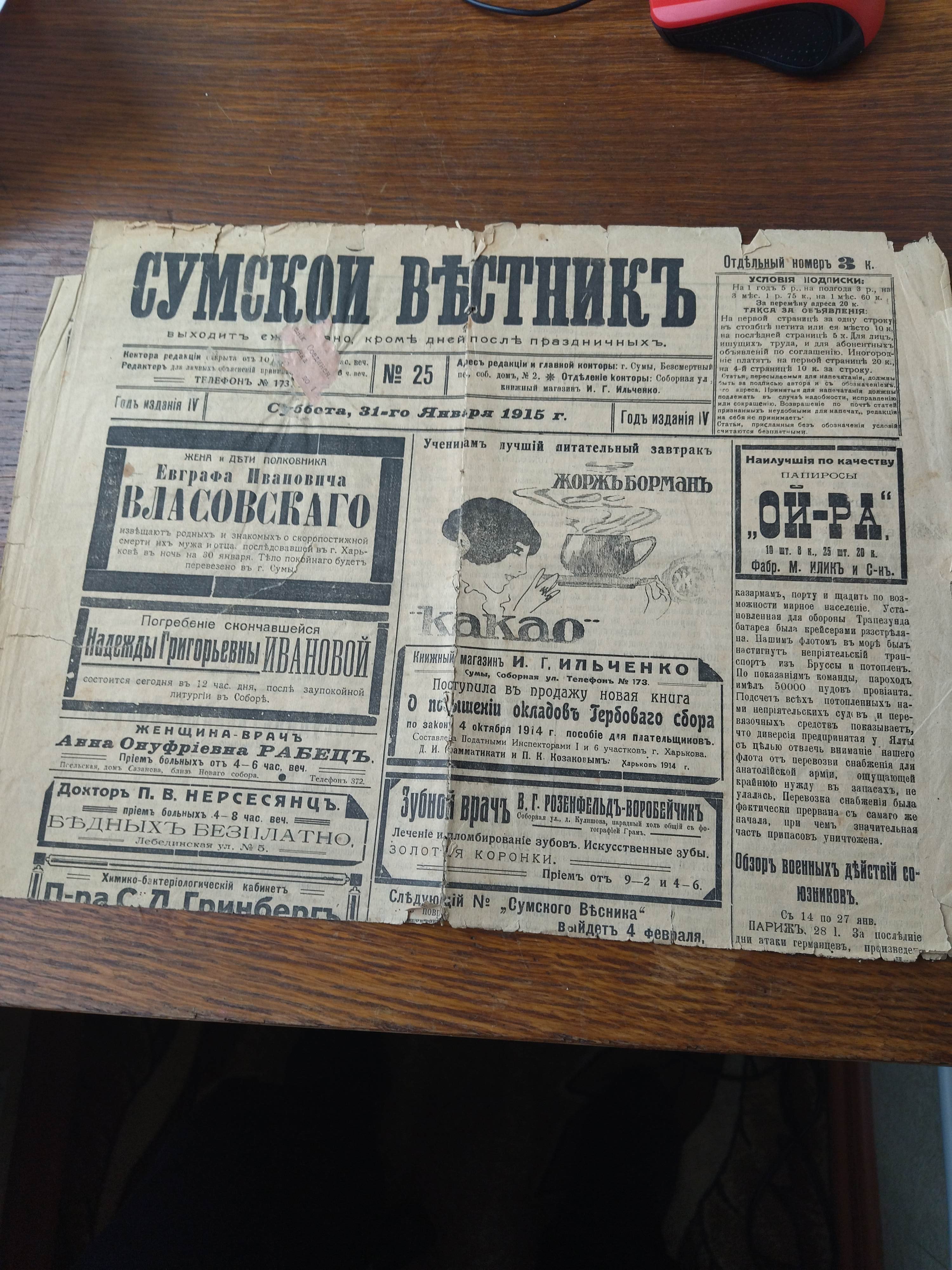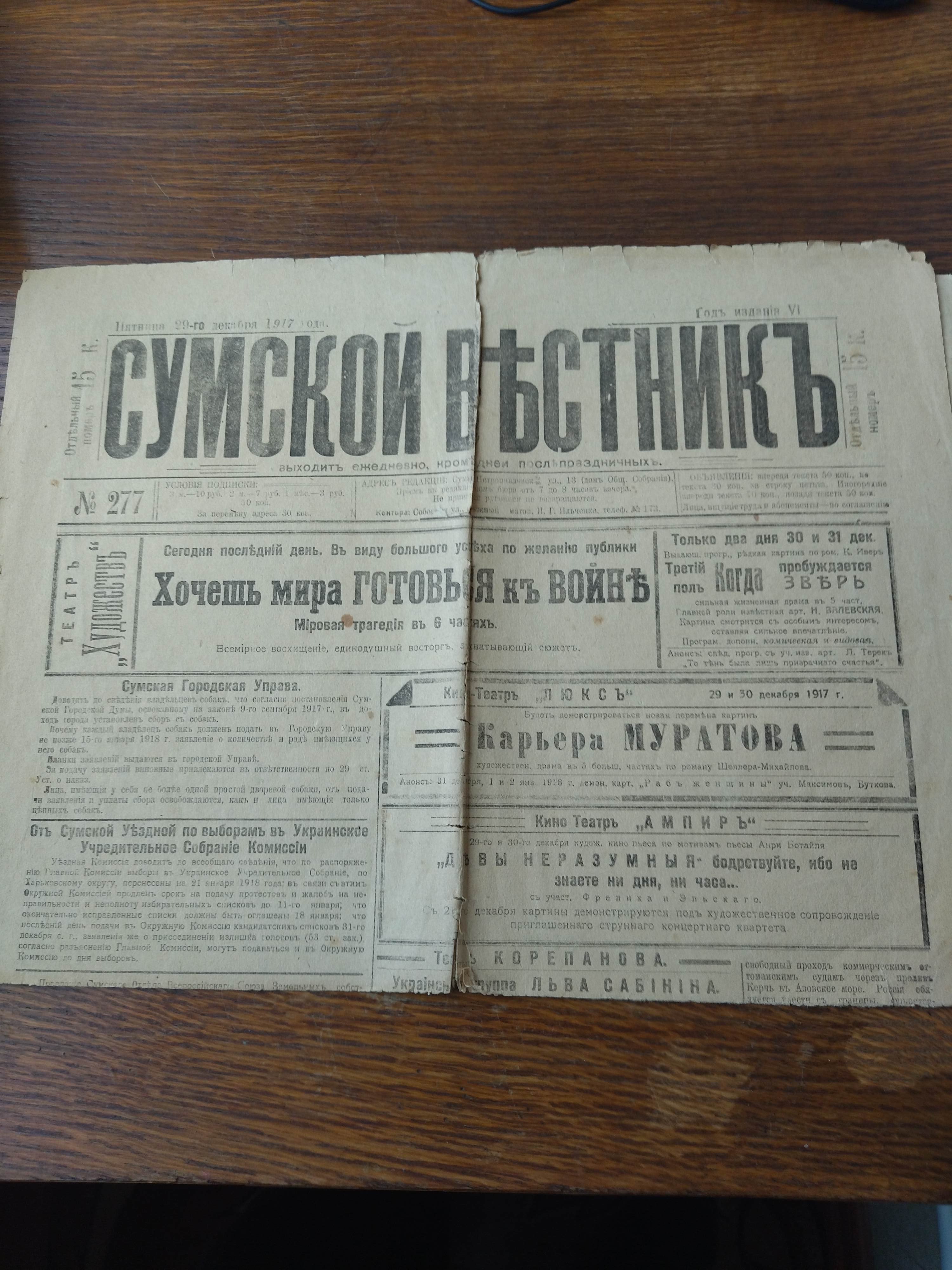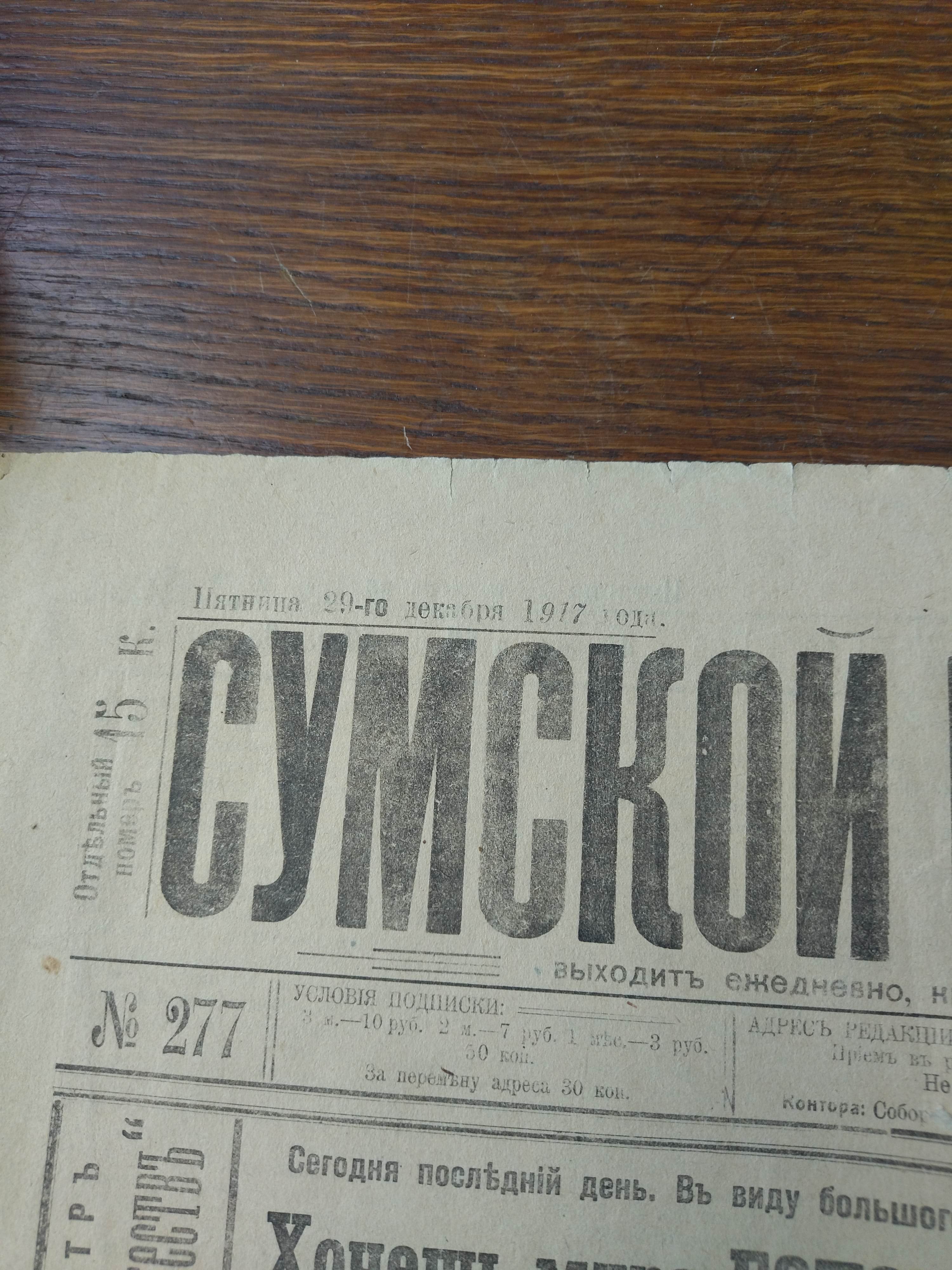 Продаются две старые газеты: "СУМСКОЙ ВЕСТНИКЪ" №25 суббота, 31 января 1915 год, на центральной полосе события Первой мировой войны; "СУМСКОЙ ВЕСТНИКЪ" №277 пятница, 29 декабря 1917 год состояние на фото, если надо дополнительные фото сделаю. Газетам больше 100 лет.