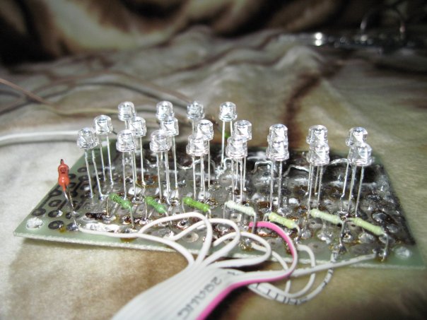 Ну и так же небольшой плагиат... пока что лишь на макетке и "сырой вариант". В недалеком будущем это чудо будет в виде 48 светодиодов красного свечения (разноцветные ставить не хочу, пусть будут только градации красного и черного на системнике, а не новогодняя елка), которые будут распределены в 2 линейки по вертикали и светиться от центра вверх и вниз.
