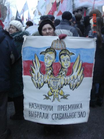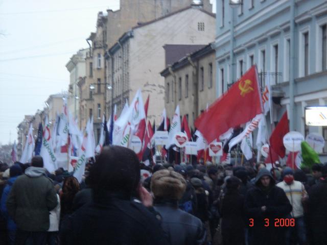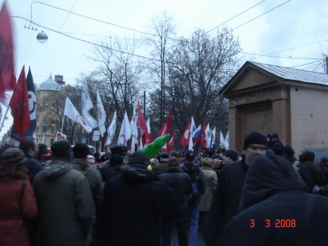 Лиговка сплошняком заставлена военными грузовиками на боковых улочках ОМОН. У бкз никого- место встречи перенесли на 4 советскую, когда подошли мы, там уже собралось порядка 600 человек. За колонной "несогласных" двойное ментовское оцепление,два грузовика ОМОНа,два метовских газика-один с камерой сверху. Снимают. Под скандирование "революция","это наш город", "лжедмитрий вон из кремля", колонна тронулась, за ней, метрах в 20-ти менты и техника. Перпендикулярные улицы перекрыты, в каждой подворотне менты. Медленно идём до садика Чернышевского, скандируют "нам нужна другая россия","долой полицейское государство" и пр. В скверике митинг, ругают "выборы", путина, правительство, мент переписывает лозунги, неожиданно выходит Шевчук из ДДТ (ему бы место на другом "концерте"), потом Борзыкин из Телевизора с песней "заколотите подвал", вокалист гр."Мухоморы" поёт песню про "план путина" и Матвиенку, любящую резать ленточки,один из выступающих вспоминает прошлый март,когда на улицы вышло 15 000 горожан (воистину,большое видится на расстояньи,и чем больше расстояние,тем больше видится)).В конце принимают резолюцию и выступает "СП Бабай", перед началом они объявляют, что задержан вокалист "Мухоморов", со сцены просят сдать атрибутику. Под надзором ментов люди расходятся.