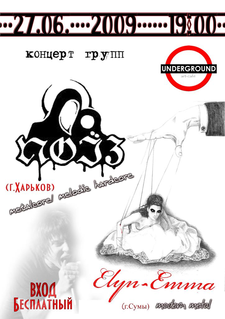 art-cafe UNDERGROUND: 12.09.2009 (сб) Концерт группы: МАГМА г.Сумы, thrash Вход бесплатный 6.09.2009 (вс) Концерт групп: 255 г.Сумы, позитив-панк Повія г.Черкассы, инди-панк Вход бесплатный