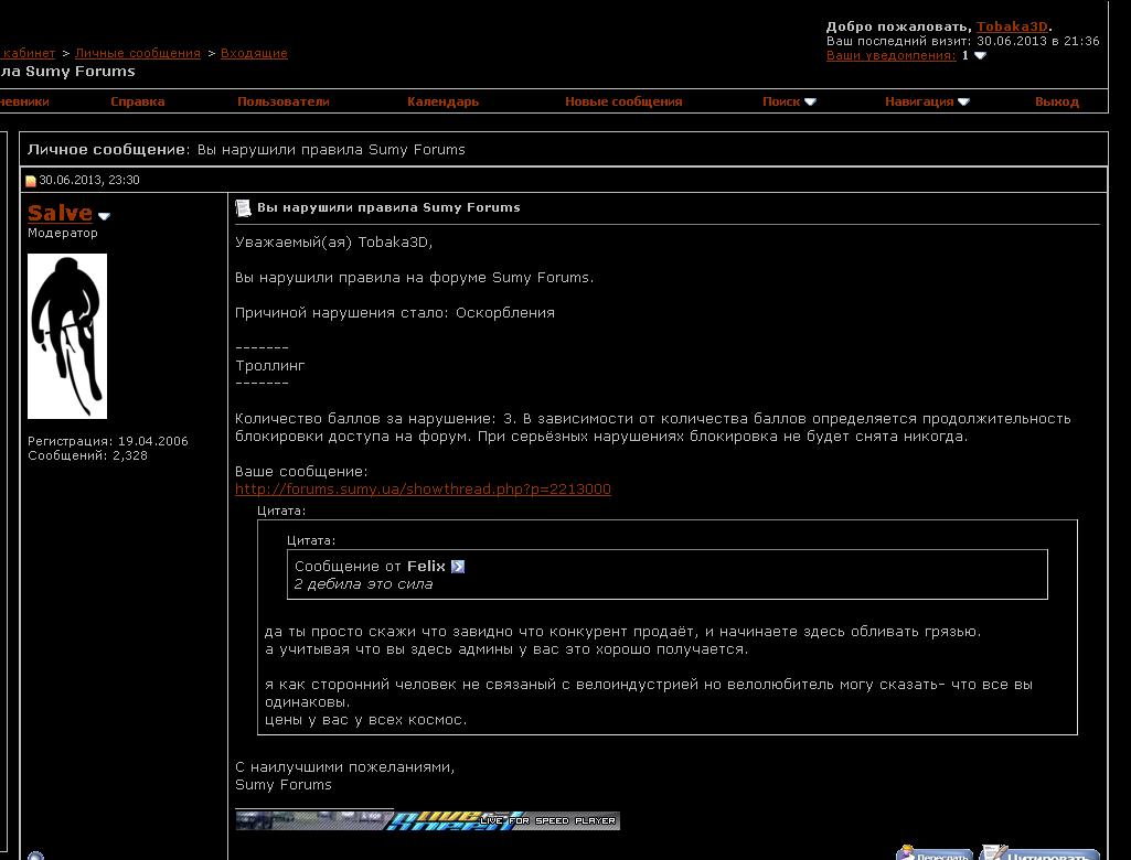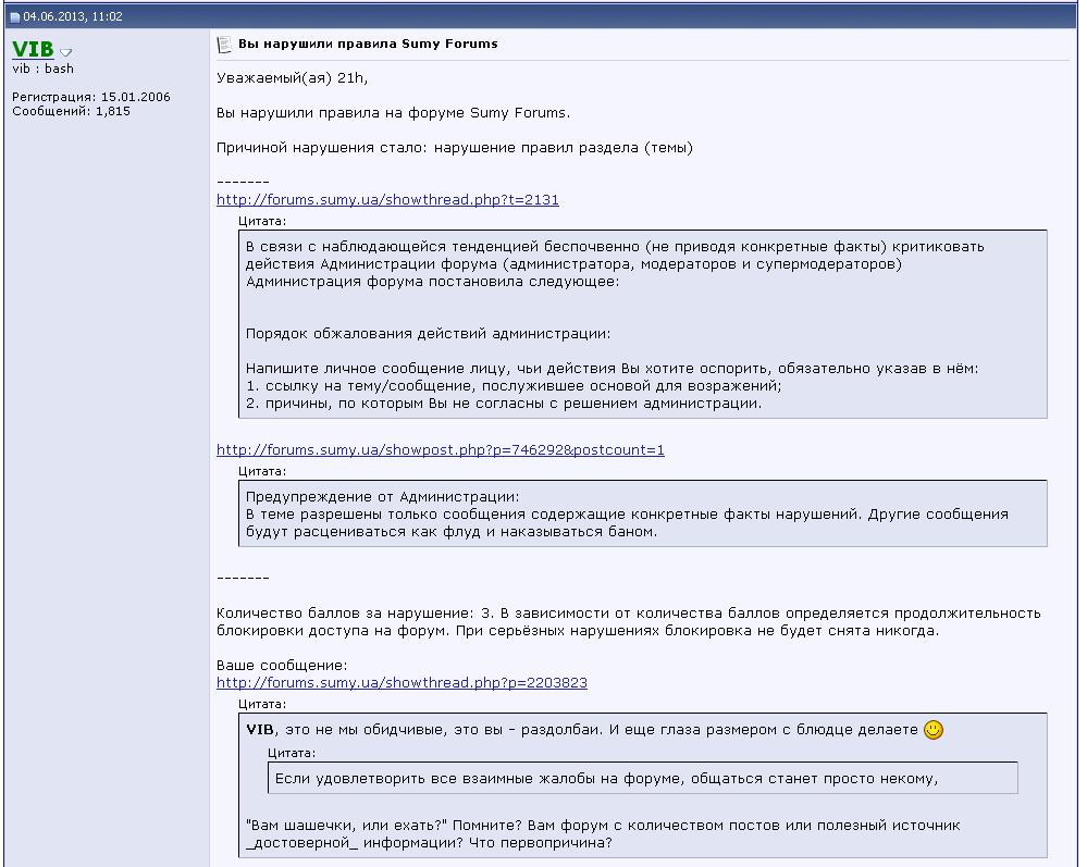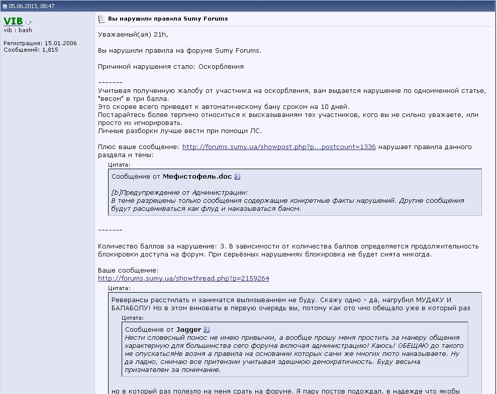 ЖДУ ПОСТЫ ДЛЯ АНАЛИЗА, ЗА КОТОРЫЕ МНЕ ВЫПИСАЛИ БАНЮ Иначе признай, Виб, что забанил ты меня либо головой не подумавши, либо пойдя на поводу своих меркантильных интересов. Потому как нельзя наказывать за преступление, документально не подтвержденное. Такие вещи у цивилизованных странах называют репрессиями.