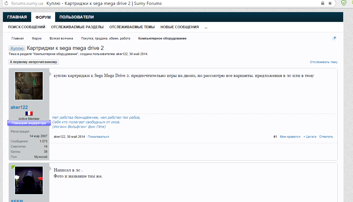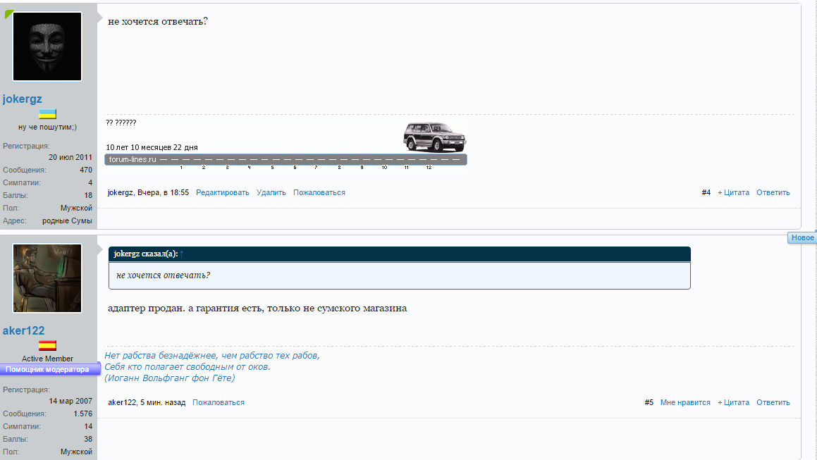 Чуть не забыл.... после его ответа что "ПРОДАНО", тему не удалял до тех пор пока я не "ТЫкнул" что бы удалил тему (в правилах "покупки/продажи" это указано!)