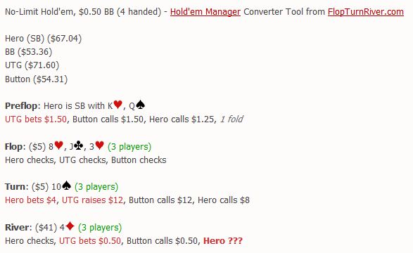 а я тебе говорил Рома, что хорошие игроки не жалеют о том, что "мне бы там карэ доехало, ухх какой банк забрал бы", вон умные люди тоже так считают :РНормально изложено так сказать взгляд под совершенно другим углом на все эти качели.