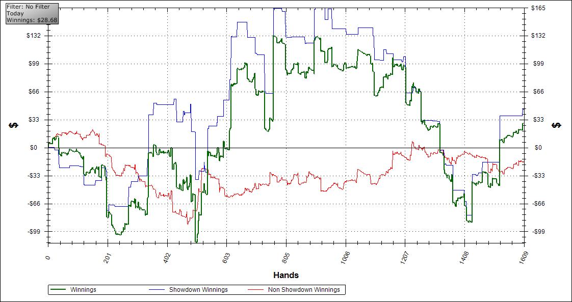 а вот и мой график. За сессию здали 7 раз КК. Выиграл я с ними только 2 раза. Из 5 проиграных- 4 префлоп сравнения с дамами. опам доходит ривером третья дама.:( Интересных раздач небыло, т.к. много было дебилов, которые опенрейзили на 130 бб, или занимались вот-такой х...й: