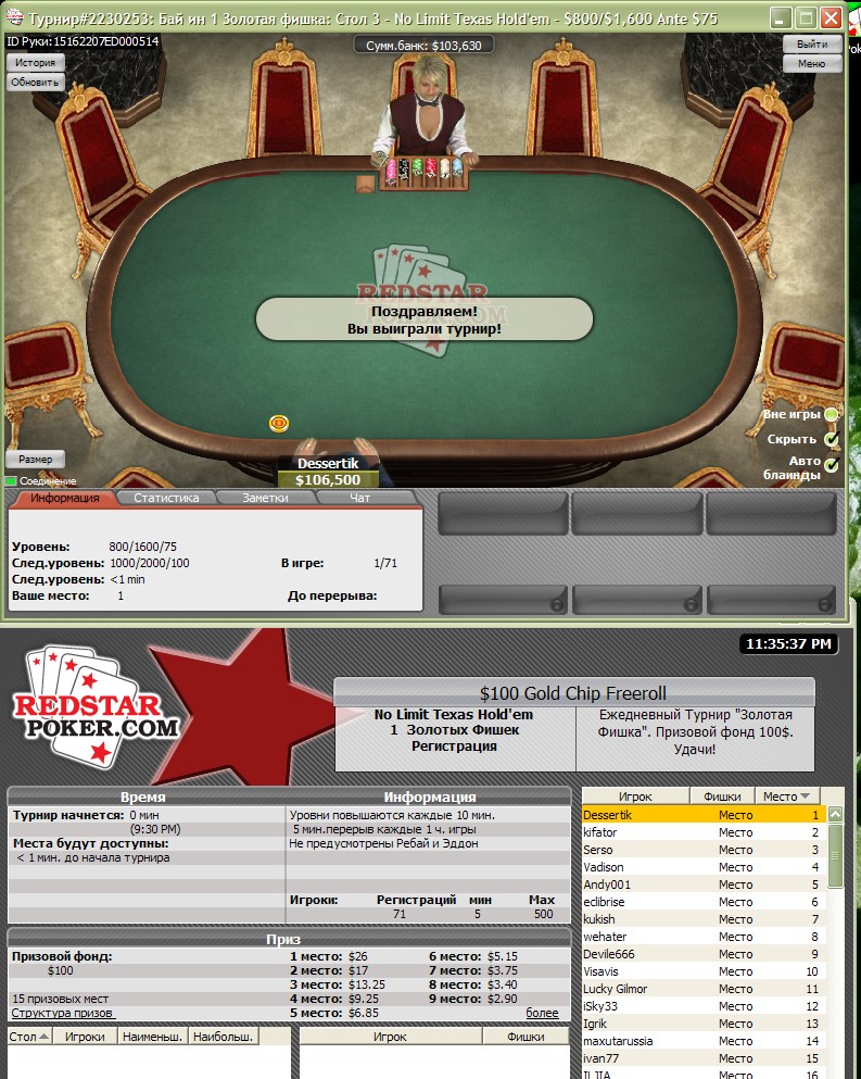 я тоже вчера играл, сначала прошел квалификацию: из 1800 чел. нужно было попасть в 50, я закончил вторым. Потом финалисты месячного отбора (и я в их числе) рубились опять за первые 50 мест(приз 640 дол. каждому и право побороться за лимон призовых) так моих тузов на олл-ине какой-то датский олень заколировал с 7,8 и на флопе приходит 6, 9, 10. почти перед финишом .Я спрашиваю - где спаведливость!? Блин, чуть монитор не разбил и в очередной раз пожалел что на мониторе нету дворников...