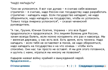 "А так, Грузия, Южная Осетия, Украина - это все будет продолжаться и продолжаться. Это лишняя болезнь для России, зачем всегда болеть, если можно искоренить это раз и навсегда. Мы - великая держава, у нас есть всё. Есть армия, есть техника. Надо нападать - если тебя не оставляют в покое, не надо обороняться, надо нападать на государства и на что хочешь - чтобы жить спокойно. Они нас так просто не оставят. И мы для этого готовимся, и шутить с нами, играться мы никому не позволим."