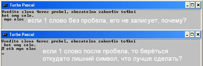 А переменную i до цикла разве не нужно инициализировать? Видимо от того символ и получается.нужна помощь в задаче со строками в паскале, нужно чтобы 1 букву слова переставляло в конец слова, ну и вывело на экран этот текст, ввод слов заканчивается точкой