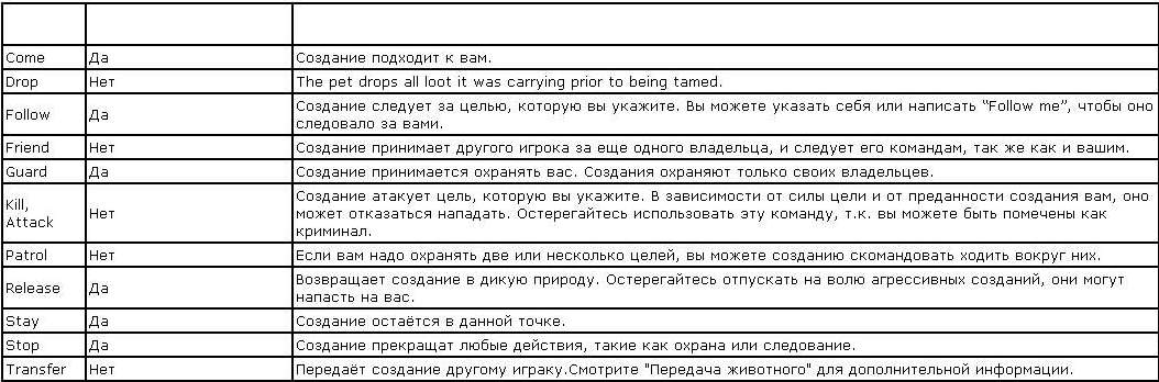 Это умение даст вам важную информацию о животном, то чем оно питается, его статы и умения. Чтобы накормить животное переместите на него еду. Так же, чтобы отдавать команды вы должны дать имя своему новому питомцу. Чтобы назвать его, зажмите мышку на создании, и вытяните его статус. Нажмите на имени, в его окне статуса, которое создание имеет на данный момент (например “a dragon”). Вы можете стереть его данное имя и заменить выбранным. Когда вы установите взаимопонимание с животным и выберите ему имя, вы сможете командовать им. Некоторые команды работают со словом “all”, вместо конкретного имени.