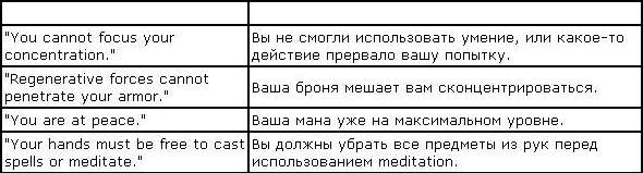 Если получиться, вы услышите звук и получите сообщение “You enter a meditative trance.” Если неполучиться вы получите одно из следующих сообщений:
