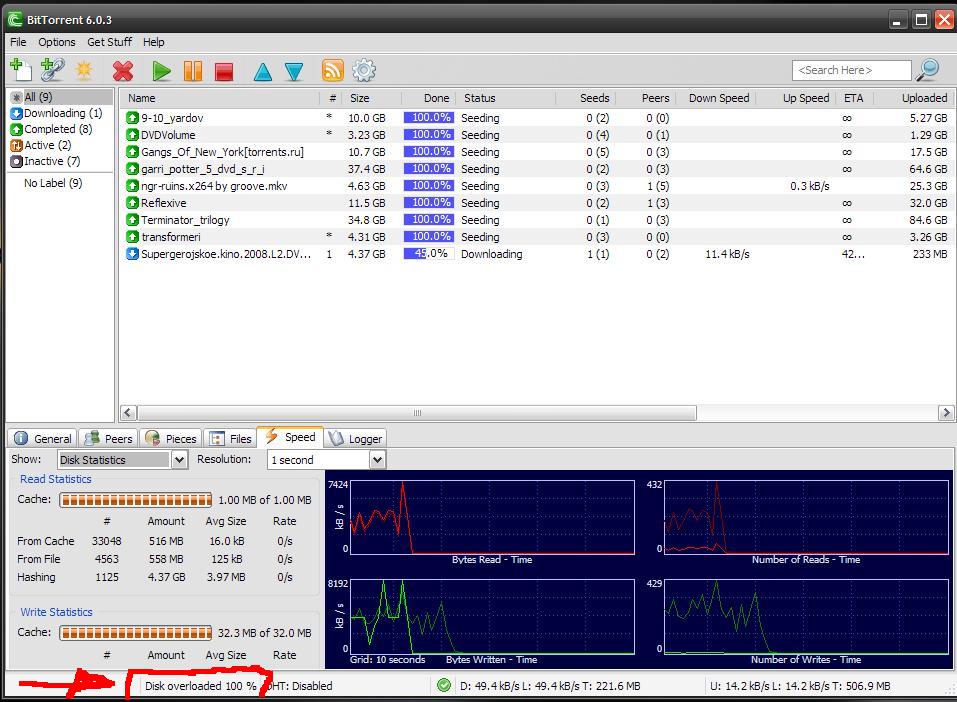 1. включи в настройках DHTЧем вызвана перегрузка диска при закачке Bit Torrent`ом (Disk overload 100%) ? Далее все закачки и отдачи прерываются на какое то непродолжительное время и затем снова возобновляются. Это вызывает большие неудобства... Как с этим бороться?