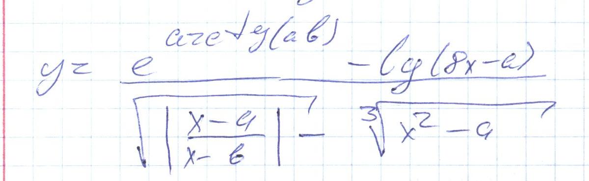 y:=(exp(arctan(a*b))-ln(8*x-a)/ln(10)))/((sqrt(abs((x-a)/(x-b)))-((x*x-a)exp(1/3)));