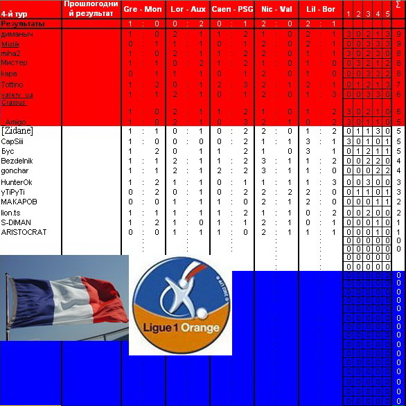 valery_ua Well-Known Member 27.08.08 #94 Гренобль - Монако 1-1 Лорьян - Осер 2-1 Кан - ПСЖ 0-1 Ницца- Валенсьенн 2-0 Лилль - Бордо 1-3