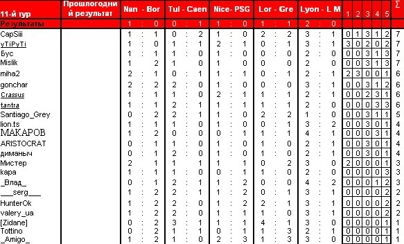 S ___serg___ Member 05.11.08 #329 Гренобль - Марсель 1-1 Бордо - Осер 2-1 Лорьян - Ницца 1-1 Сошо - Ле Ман 0-1 ПСЖ - Лилль 1-0