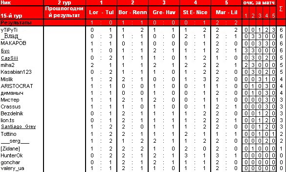 S sumysales Member 22.11.08 #396 Лорьян - Тулуза 1-1 Бордо - Ренн 0-0 Гренобль - Ле Гавр 1-0 Сент Этьенн - Ницца 0-1 Марсель - Лилль 2-0