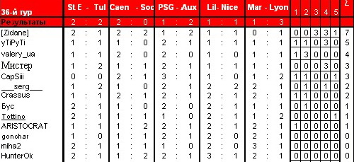 yTiPyTi Member Модератор 15.05.09 #783 Сент - Этьенн - Тулуза 1:1 Кан - Сошо 1-0 ПСЖ - Осер 2-1 Лилль - Ницца 1-1 Марсель - Лион 1-1