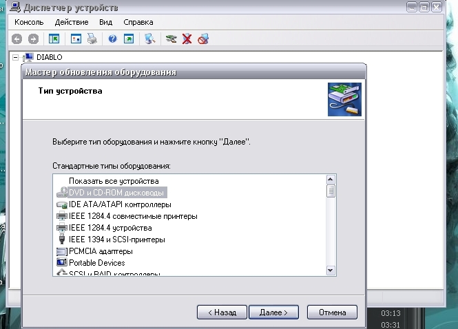 Все это в диспечере устройств конечно-же. Драйвер выбрать именно винды (тоесть СД ДВД дисководы)