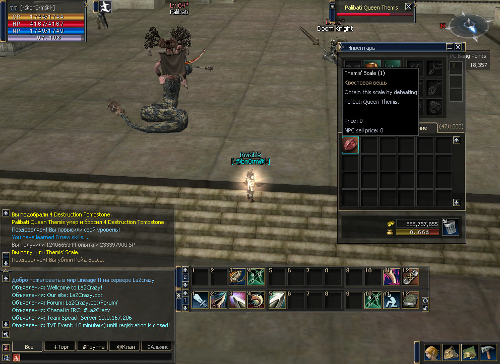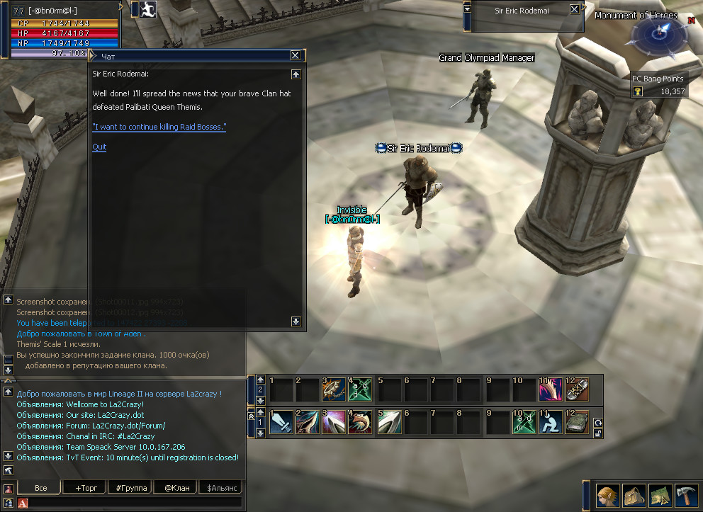 Репутация клана в ИЛ - старая трабла. Реализовано у меня то оно было, но работало как то не совсем так как надо(причину нашли позже, но то было камаель=)) ).да было бы неплохо если б там заработали такие мелочи, как олимпиада, квест "репутация клана", нобл телепорты