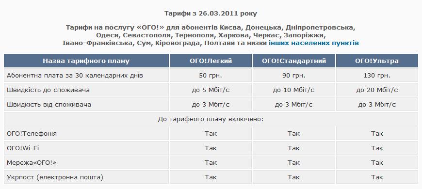 Тарифи на послугу «ОГО!» для абонентів Києва, Донецька, Дніпропетровська,
