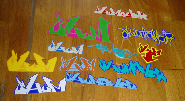 Есть несколько вариантов,первый-самый простой:делаешь на каком-нибудь фотошопе-кореле или сканируешь и распечатываешь. Второй посложнее:каждый стикер рисуешь вручную и расклеиваешь. Третий:можно вырезать из оракала(как фото). Можешь сам придумать еще сбособ
