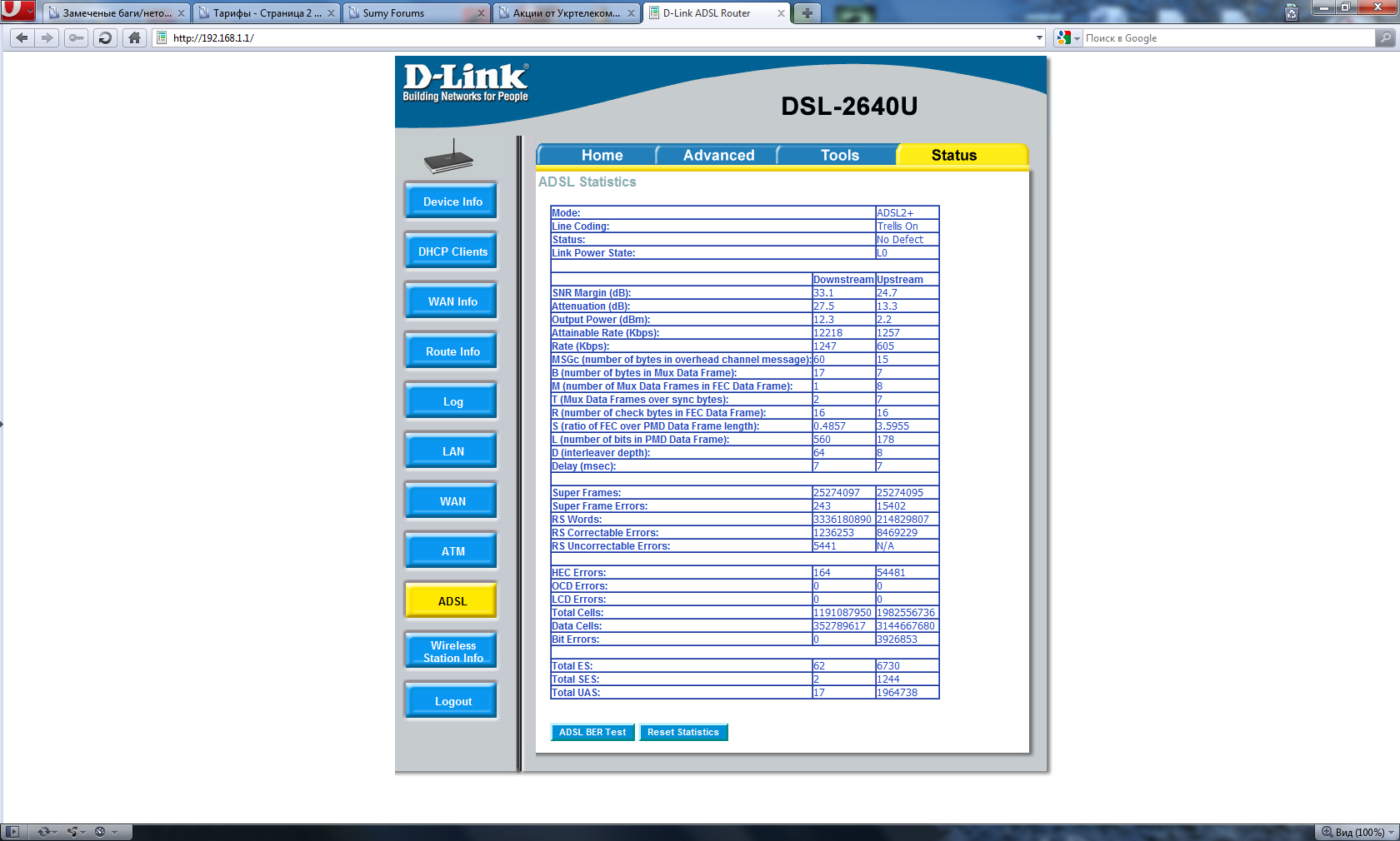 SNR Margin (dB): 11.6 11.8 тут показано отношение сигнал\шум на твоей линии Чем больше тем лучше.