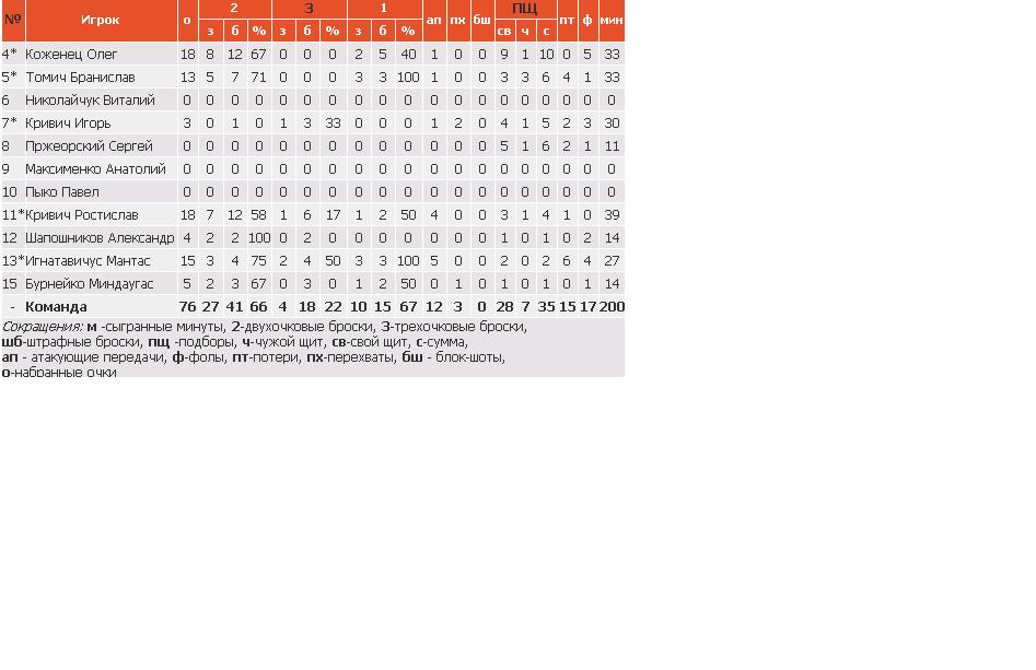 Сокращения: м -сыгранные минуты, 2-двухочковые броски, 3-трехочковые броски,