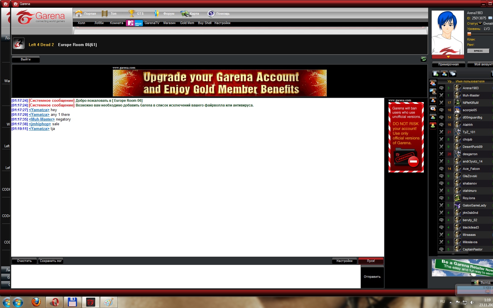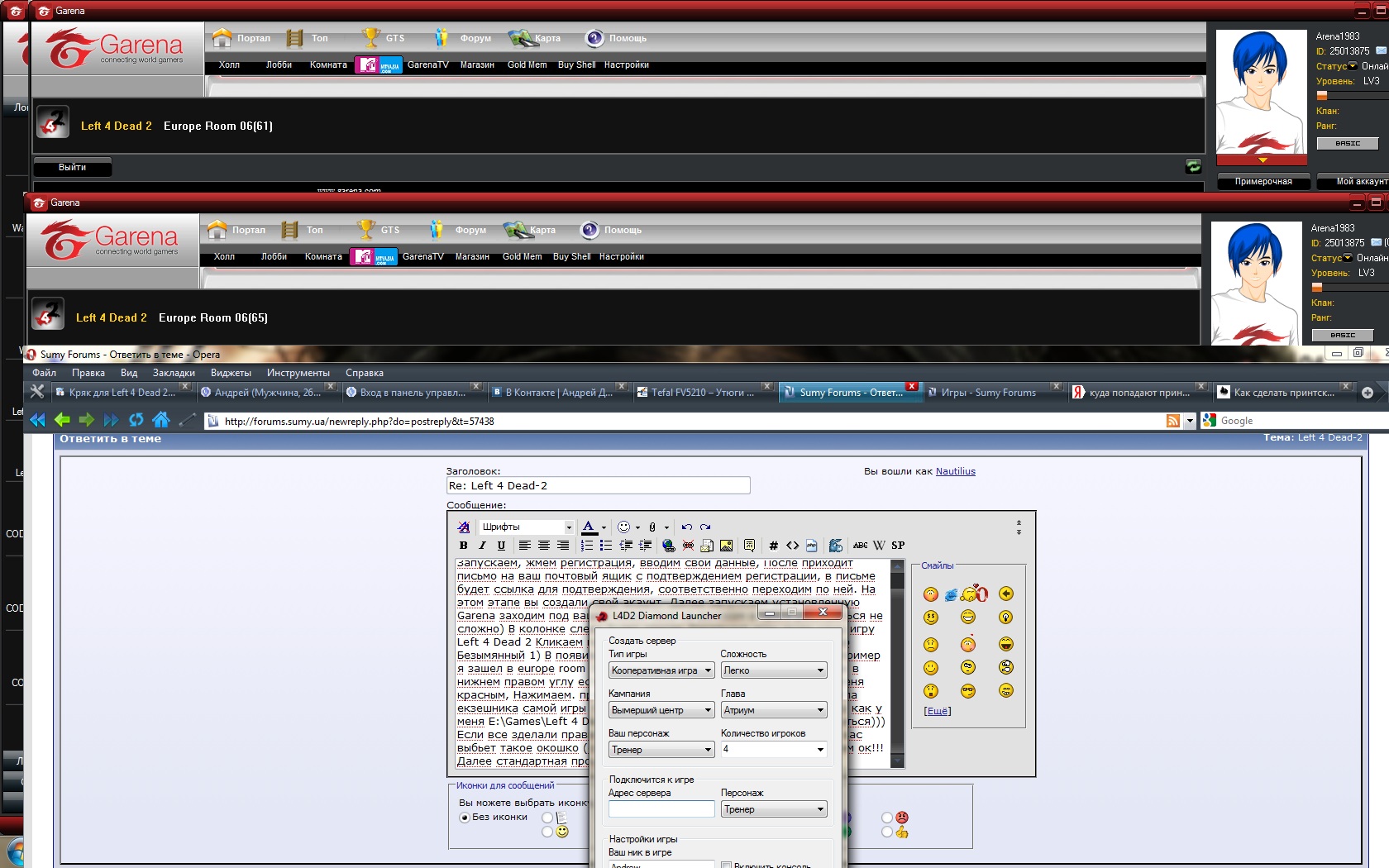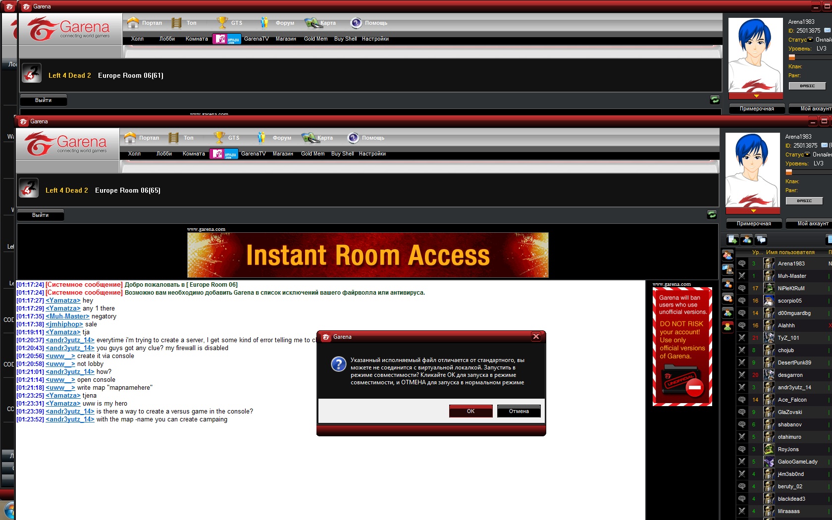 )))) Инсталим GarenaRU_setup.rar (архив прилагается) Запускаем, жмем регистрация, вводим свои данные, После приходит письмо на ваш почтовый ящик с подтверждением регистрации, в письме будет ссылка для подтверждения, соответственно переходим по ней. На этом этапе вы создали свой акаунт. Далее запускаем установленную Garena заходим под вашим ником (все на русском в проге разобраться не сложно) В колонке слева будет список Локальные игры ищем нашу игру Left 4 Dead 2 Кликаем по ней появится список (смотри скринсервер Безымянный 1) В появившемся окне заходим в одну и з комнат. Например я зашел в europe room 3 (смотри скринсервер Безымянный 2) Далее в нижнем правом углу есть кнопочка пуск на скрине подсвечена у меня красным, Нажимаем. программа запросит место расположения файла екзешника самой игры т.е вам нужно будет указать путь (например как у меня E:\Games\Left 4 Dead 2\launcher.exe) У вас он может и отличаться))) Если все зделали правильно при последующем нажатии на пуск у вас выбьет такое окошко (смотри скринсервер Безымянный 3) Нажимаем ок!!! Далее стандартная процедура (смотри скринсервер Безымянный 4) Нажимаем пуск и вперед )))) Там где в игре компания игра по серверу steam выбираем понравившегося вам пользователя и играем)))) НУ вродебы все ))) Приятной игры )))