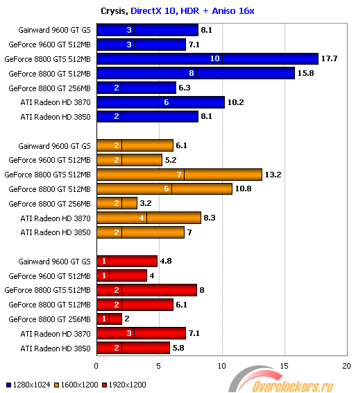 Это обман. Разница в минимлаьном fps почти в 3 раза. Разницы между видеокартами может не быть если мало памяти и или слабый проц.ну как показали тесты на самой ресурсоемкой игре кризис в разных директах и разрешениях а так же настройках сглаживания 9600 в самом тяжелом режиме 9600 обошла 8800 не пострясающе ли