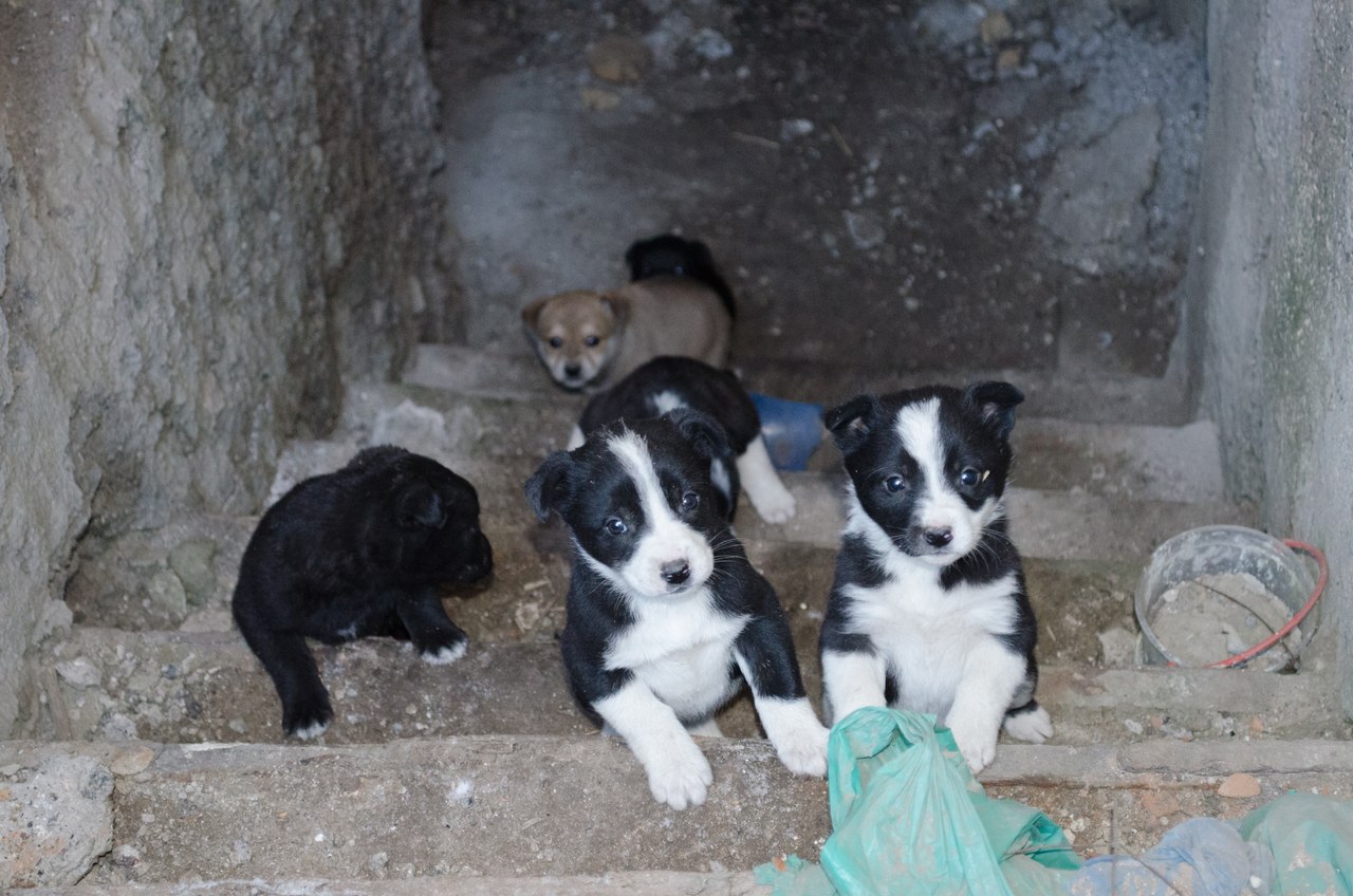 6 щенков, живут в заброшенном погребе, на улице. Дверей в погребе нету, там немногим теплее чем на улице.Спасаются от холода лишь греясь о друг дружку, а также мыслями о теплом доме.