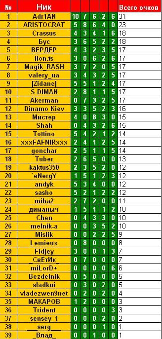 Собственно вот таблицы по каждому туру ( номер тура соответствует номеру тура УПЛ. Поскольку на 1 тур УПЛ прогноза не было, поэтому отсчет ведём со второго тура чемпионата). По 5-му туру будет сделан перерасчет итогов, после того как будет сыгран перенесённый на 23.09 матч между командами Металлист-Шахтёр.