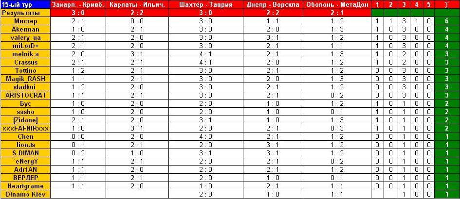 valery_ua Well-Known Member 01.12.09 #358 Карпаты - Ворскла 2:1 Металлист - Оболонь 1:0 Металлург З - Таврия 1:2 Закарпатье - Ильичевец 0:0 Днепр - Металлург Д 1:1