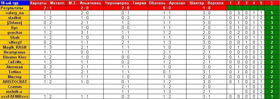 Відповідь: Спортпрогноз УПЛ 2009/2010 (Украина) Карпаты - Металлист 0-3 Металлург З - Ильичевец 2-1 Черноморец - Таврия 1-1 Оболонь - Арсенал К 1-0 Шахтер - Ворскла 3-0
