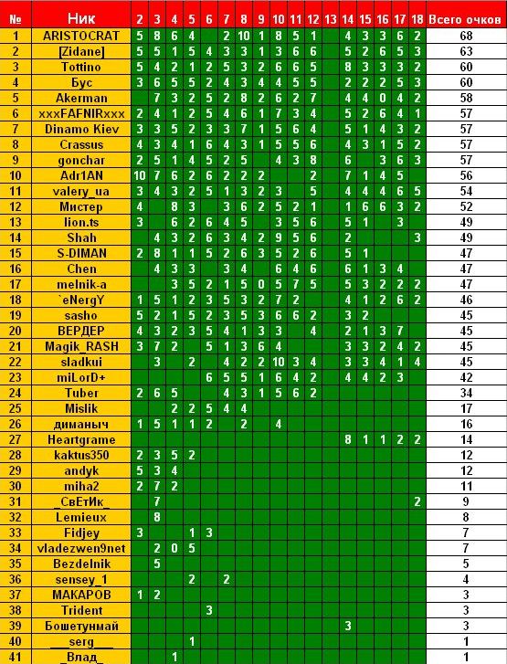 xxxFAFNIRxxx Вечный студент :) 01.03.10 #419 Результаты матчей: Карпаты - Металлист 2-1 Металлург З - Ильичевец 2-0 Черноморец - Таврия 2-0 Оболонь - Арсенал К 0-0 Шахтер - Ворскла 1-0 Вкладення 18.jpg 86.6 КБ Перегляди: 244 itog.jpg 133.7 КБ Перегляди: 278