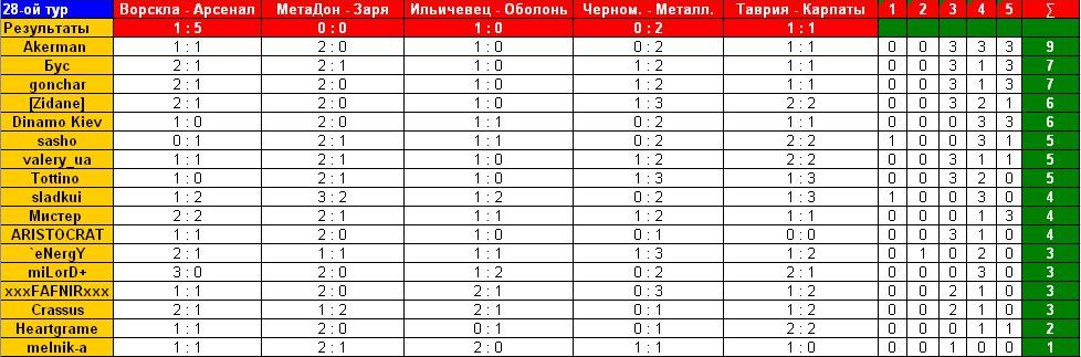 melnik-a Member 30.04.10 #635 Ворскла - Арсенал 1-1 Металлург Д - Заря 2-1 Ильичевец - Оболонь 2-0 Черноморец - Металлист 1-1 Таврия - Карпаты 1-0