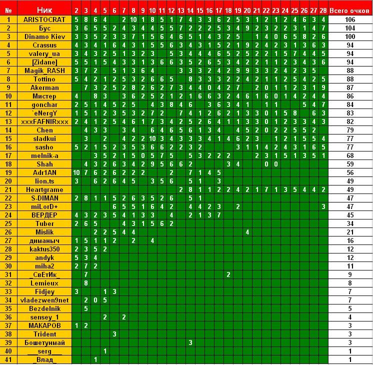 ARISTOCRAT модератор Модератор 30.04.10 #636 Ворскла - Арсенал 1-1 Металлург Д - Заря 2-0 Ильичевец - Оболонь 1-0 Черноморец - Металлист 0-1 Таврия - Карпаты 0-0