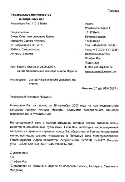 3) В листі стверджується, що в інституті (знову таки, якому) немає інформації. І тут же є порада звернутися за бльш детальною інформацію до військового архіву та до військово-історичного інституту в Потсдамі.. Хотілося б побачити, на лист від цих поважних установ.