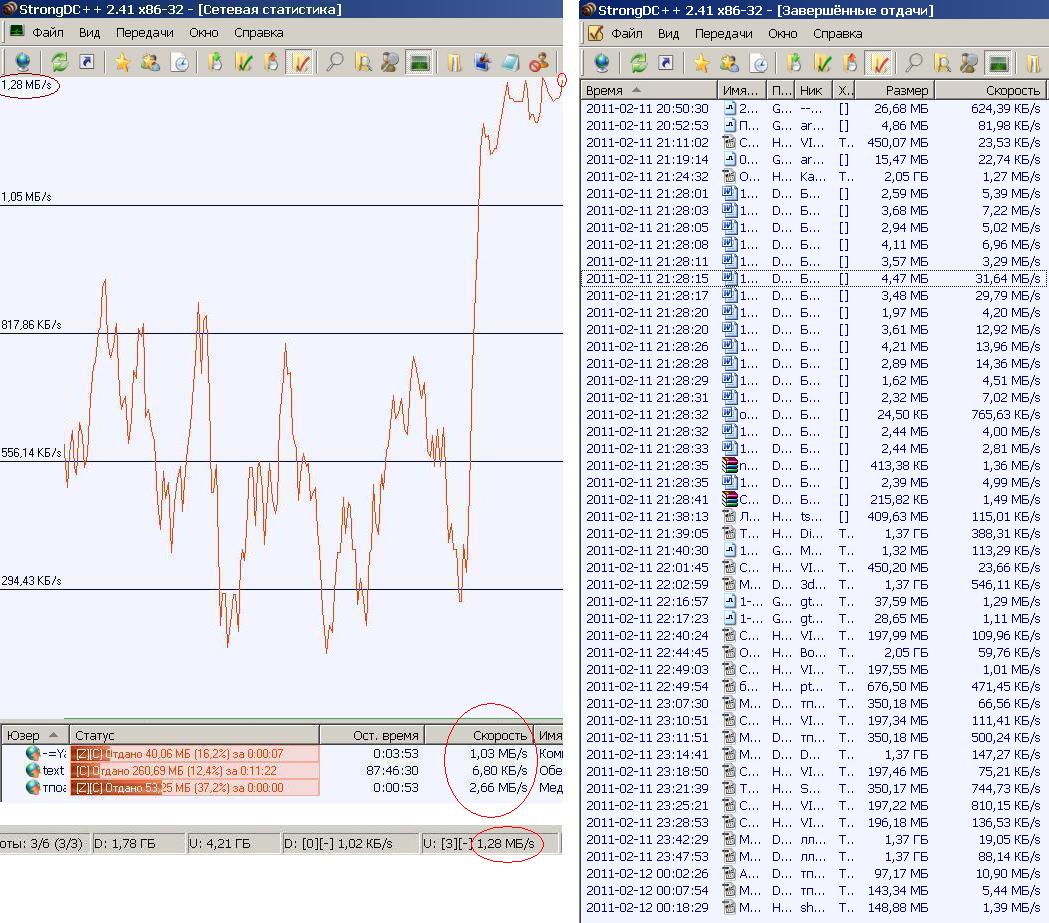 Так вот: показатели мгновенной скорости в розницу (по отдельным файлам) и протоколы загрузки/отдачи файлов явно грешат завышением скорости. Я склонен верить общей мгновенной скорости и графику сетевой статистики. У меня канал 10 мегабит (от КС) - до 10-и и показывают (а не нечто вздорное типа 31,64МБ/с = 253 мегабита). Кто бы объяснил - откуда там такие показатели?