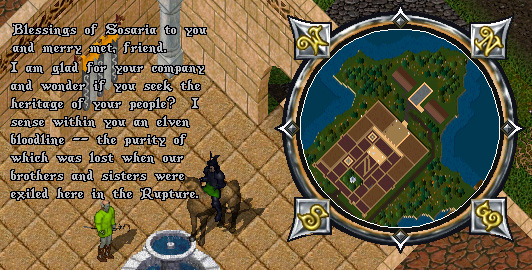 Первым шагом к становленю эльфом является посещение некого Darius the Wise. Сего человека можно найти в далеком северо-западном здании в Moonglow. Просто подойдите к нему и позвольте ему закончить свою речь.