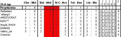 процент прогнозируемости матчей: Челси - Ман Сити 0 из 21- 0% Болтон - Вулверхемптон 9 из 21 - 43% Сток Сити - Арсенал 9 из 24 - 37% Тоттенхем - Эвертон 10 из 24 - 41% Ливерпуль - Блекберн 18 из 24 - 75% ( рекорд однако)