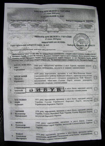 Як повідомляється, представники А.ГРИЦЕНКА останніми днями виявили чималу кількість виборчих бюлетенів, в яких напроти прізвища цього кандидата стоїть штамп “вибув”.