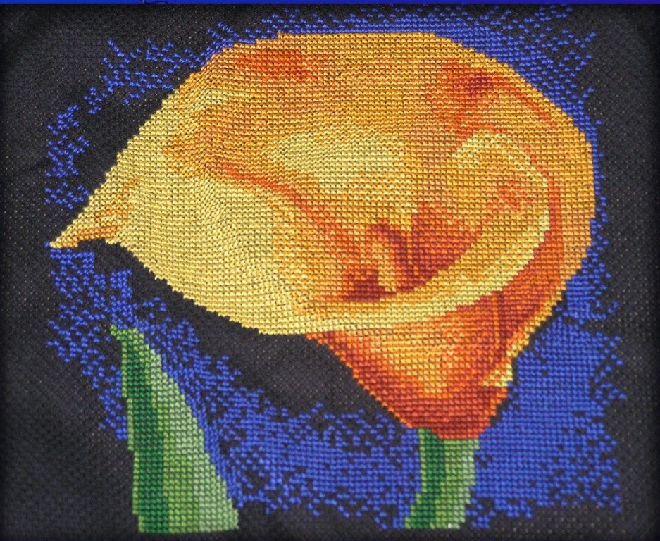 а канва сейчас самая разнообразная продается лично у меня есть голубая и цвета льна, как на моей последней вышивке, а вот и работа есть на черной канве я ее уже тут выставляла,необязательно "закрашивать"канву в нужный цвет, тем более если канва белая-то чтоб ее сделать черной нужно как минимум в 3 нитки вышивать, это и неудобно и не практично!!!
