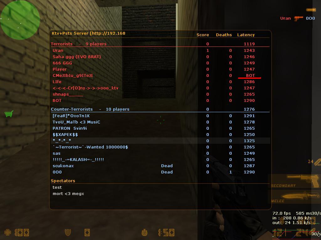 Gr@4 Особый статус 20.03.07 #67 ЫЫ А вот обратите внимание на пинг(ну это еще ладно),а вот что делает бот на серве???Боты уже охамели,на сервы лезут Вкладення de_train0000.JPG 83.6 КБ Перегляди: 624