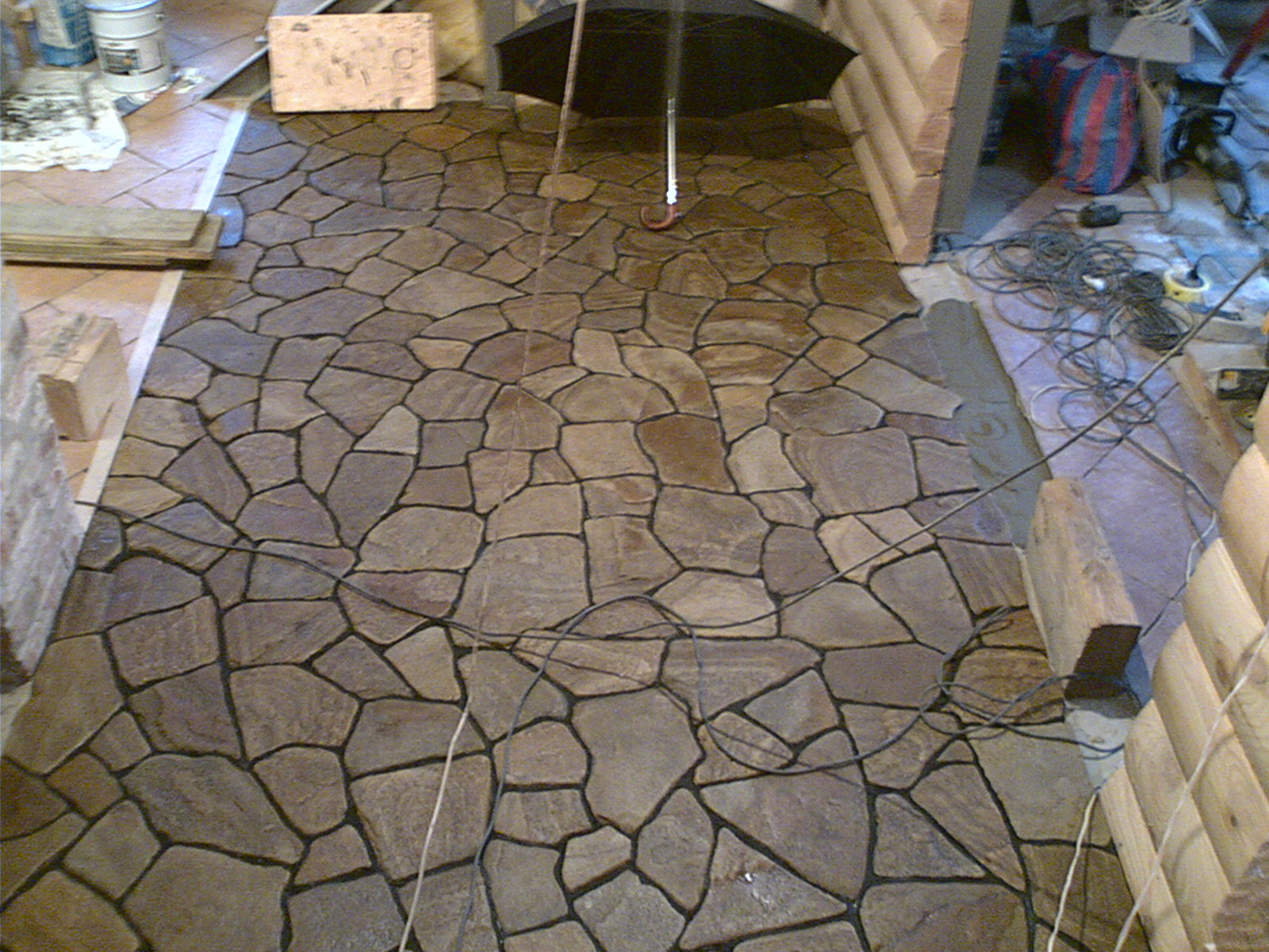Может кому интересно будет.Стоимость работы за м2 94гр.(укладка песчаника,устройство цветного шва,покрытие износостойким лаком)