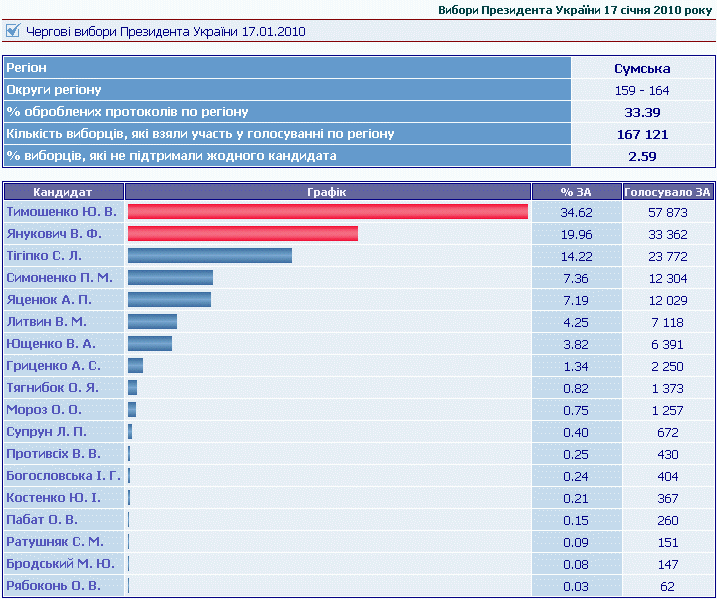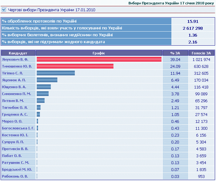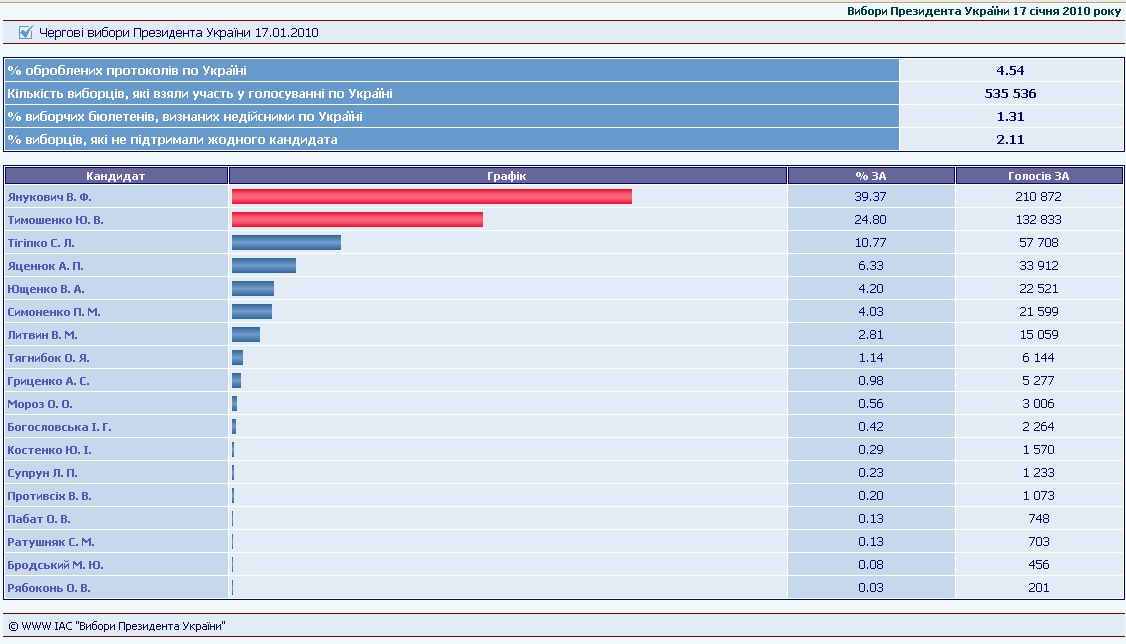 За результатами опрацювання 2,11% виборчих бюлетенів, у першому турі виборів президента лідирує Віктор ЯНУКОВИЧ
