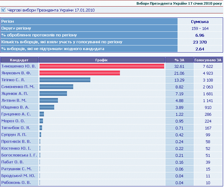 Только 3.11% обработано голосов. Наверно попались первыми из Донецкой области.уже экзит-полы 2-го тура есть. В среднем 44% на 38% в пользу Януковича... Хм... Озадачен, откуда у него взялось еще 9% - нипанятна...