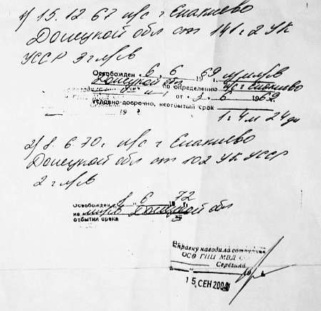 освобожден 6.6.69 из м л/св Донецкой области по определению н/с Енакиево от 3.06.69 условно-досрочно, неотбытый срок: 1 г 4 м 24 дн